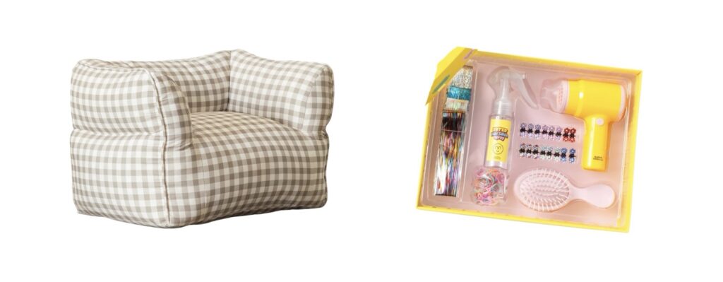 I love this brand- this hair kit will be a hit! Mini blow dryer that blows air, hair tinsel, flower gems, hair elastics, brush and spray bottle.